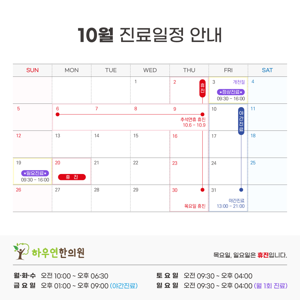 아름다운 가을의 정취가 무르익는 10월이 찾아왔습니다. 드높고 청명한 하늘과 오색빛깔 단풍이 어우러져 깊은 감동을 선사하는 계절입니다. 이처럼 풍요로운 가을을 맞아 여러분 모두 건강하고 활기찬 기간을 보내고 계시는지 궁금한데요. 하우연한의원은 이 아름다운 계절을 더욱 건강하게 보내 실수 있도록 최선을 다하겠습니다. 오늘은 10월 하우연한의원의 진료 일정을 안내해 드립니다.