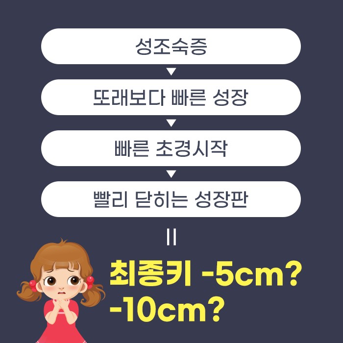 요즘은 환경호르몬 등 환경적 요인과 잘못된 생활습관, 타고난 체질 등에 의해 발생하는 성조숙증과 빠른 사춘기는 빠른 초경이라는 결과를 낳습니다. 일반적인 성장 속도에 맞춰 시작한 초경이 아닌 빠른 초경은 사춘기 여자아이에게 여러 모로 불리합니다. 가장 중요한 것은 최종 키가 정상적인 시기에 사춘기를 보내며 초경을 거친 아이들보다 성대적으로 작을 확률이 커집니다.