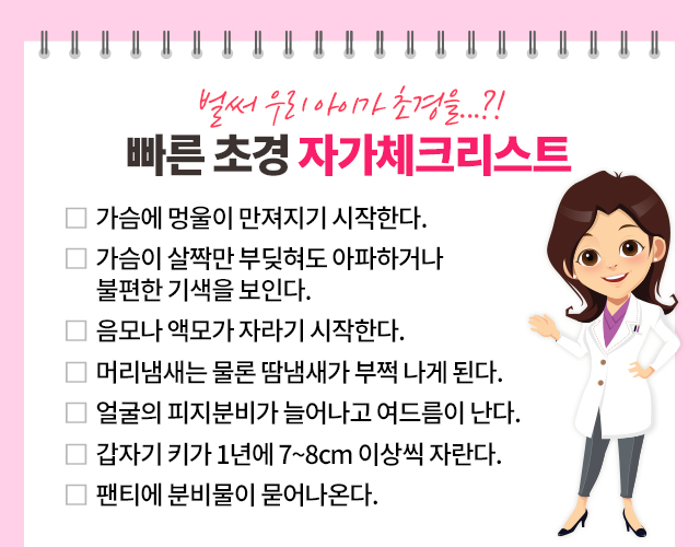 평소 자녀의 성장을 정기적으로 체크해주선 부모님들도 갑자기 아이 속옷에 냉대하 같은 분비물이 발견되면 놀라게 됩니다. 더욱이 아무런 준비도 되지 않은 상태에서 초경을 겪게 되면 아이 뿐만 아니라 부모님들도 많이 놀라게 됩니다. 아이들의 성장 속도를 눈에 보이는 것이 전부가 아닙니다. 성조숙증 진단 기준의 나이가 지난 자녀를 키우는 부모님이라면 빠른 초경의 징후를 알고 아이의 몸 상태를 체크해주셔야 합니다.