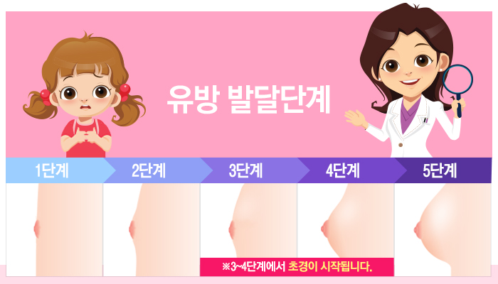 가슴 멍울의 경우 1차와 2차로 구분되며, 1차 가슴 멍울이 생긴 시점부터 평균적으로 1년 반~ 2년 후 초경을 예측합니다.